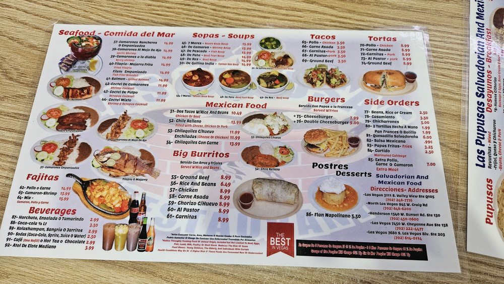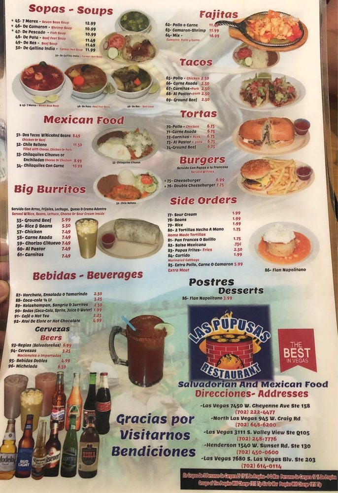 Las Pupusas Restaurant in Las Vegas is a hidden gem offering authentic Mexican and Salvadoran cuisine. The menu boasts a variety of dishes, with highlights including flavorful pupusas and juicy huevos rancheros. Customers rave about the generous portions, affordable prices, and excellent service. The ambiance feels old school, adding to the dining experience. The breakfast options, such as casamiento and huevos con chorizo, showcase the restaurant's commitment to authenticity and quality. The busy atmosphere and positive reviews reflect the restaurant's popularity and reputation for delicious food. Whether you're a fan of pupusas or looking to try something new, Las Pupusas Restaurant is a must-visit spot for a satisfying meal.